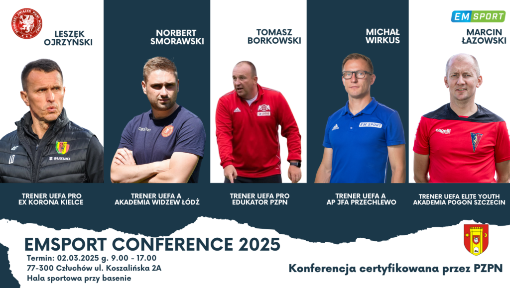 Pomorski Związek Piłki Nożnej zaprasza trenerów i animatorów piłki nożnej na konferencję metodyczną, która odbędzie w dniu 02 marca 2025 roku się w miejscowości Człuchów. Prelegentami będą trenerzy Leszek Ojrzyński, Tomasz Borkowski, Marcin Łazowski, Michał Wirkus oraz Norbert Smorawski. Konferencja jest certyfikowana przez PZPN liczbą 5 godzin szkoleniowych. Trenerzy – wykładowcy Leszek Ojrzyński jest trenerem […]